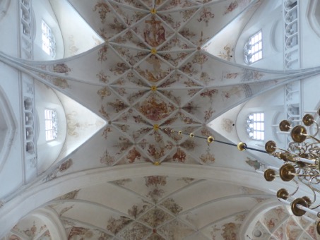 Na de filmvertoning konden de schilderingen in het koor van dichtbij – op de bouwsteiger – worden bekeken. Acht trappen (!) brachten ons naar het gewelf op 26 meter hoogte (foto 3-4).