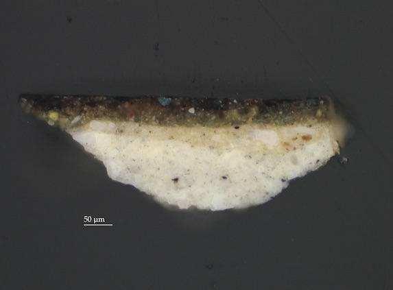 I restored Van Goyen’s painting more than three years prior to the day that I forgot the name of the tree. The curators decided that it was going to be part of a Rijksmuseum exhibition travelling to Sydney in 2017. The obscuring yellowed varnish and discoloured retouchings along the original horizontal seam were considered to be disturbing. (figures 2, 3)Through one sentence found in the Rijksmuseum archives, I knew that the painting had been wax-resin lined in 1965 and when I started my treatment it was structurally stable enough for transport. I didn’t know what other treatments were carried out in the past, because none of our colleagues that touched the painting before I did, had left me a message. After removing the yellowed varnish and discoloured overpaint with organic solvents, without visually affecting the underlying original paint, the beautiful tonality with its pale grey sky and green and brown tree leaves (re)appeared (figure 4). In present day painting conservation, the original materiality of a painting is seen as the most important thing to conserve and protect, but not necessarily to present. While removing the non-original varnish, overpaint and fillings, the original horizontal seam connecting the two pieces of canvas became visible (figure 5). I was delighted when I saw the stitching, because it’s something that usually cannot be seen and was not meant to be seen. Exactly this made me feel very close to Jan van Goyen, who besides my earlier colleague was probably one of the only people who had seen the same. From the cross-sections that I took, I learnt that when Van Goyen started working on this painting, he applied two thick, oil-based ground layers, which covered the seam and provided a smooth surface to paint on (figures 6, 7). He applied the subsequent paint layers, without making any preliminary drawing, very thinly and vigorously. XRF spot analysis combined with investigation of several cross sections, shows that Van Goyen’s paint consisted of lead white, bone black, smalt, verdigris, lead tin yellow and several earth pigments. The pressure and heat applied when the painting was wax-resin lined more than two centuries later in 1965, had pushed the original stitching through the ground and paint layers to the front of the painting. Because of this, the paint got damaged along the seam, which resulted in the need of my predecessor to fill and retouch the paint losses that had occurred here.