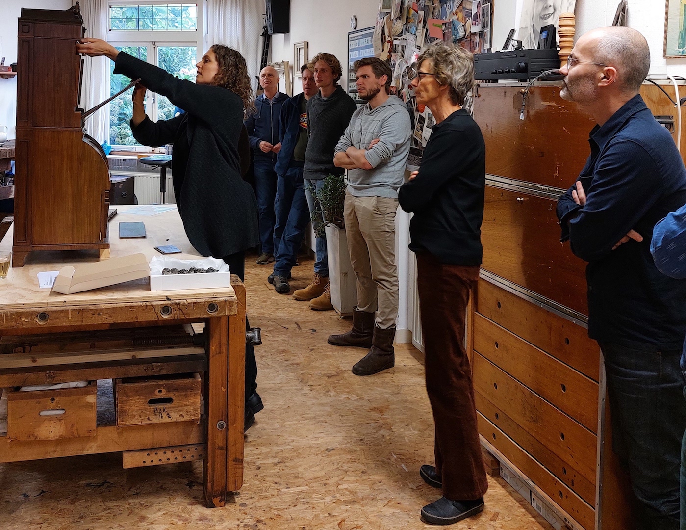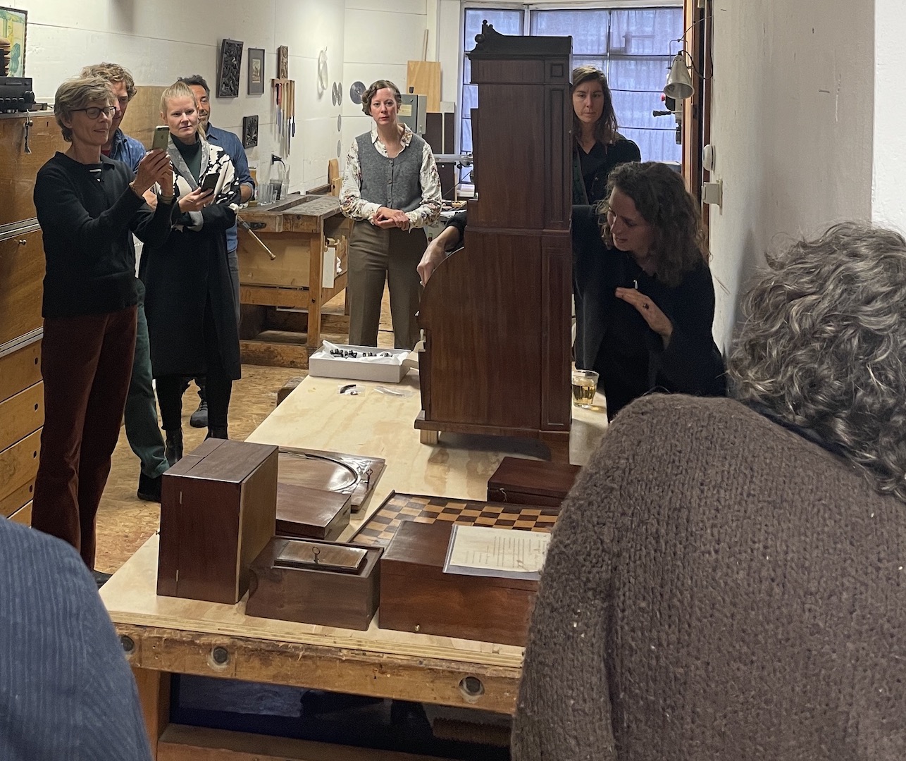 Op vrijdag 22 oktober vond tussen 15:00 en 18:00 een werkbezoek plaats in het atelier van meubelrestaurator Brigitte Taal in Den Haag. Dit was de tweede bijeenkomst van de werkgroep meubelrestauratoren. De bezoekers kregen uitleg over en een inkijkje in de restauratie van een bijzonder meubel.
