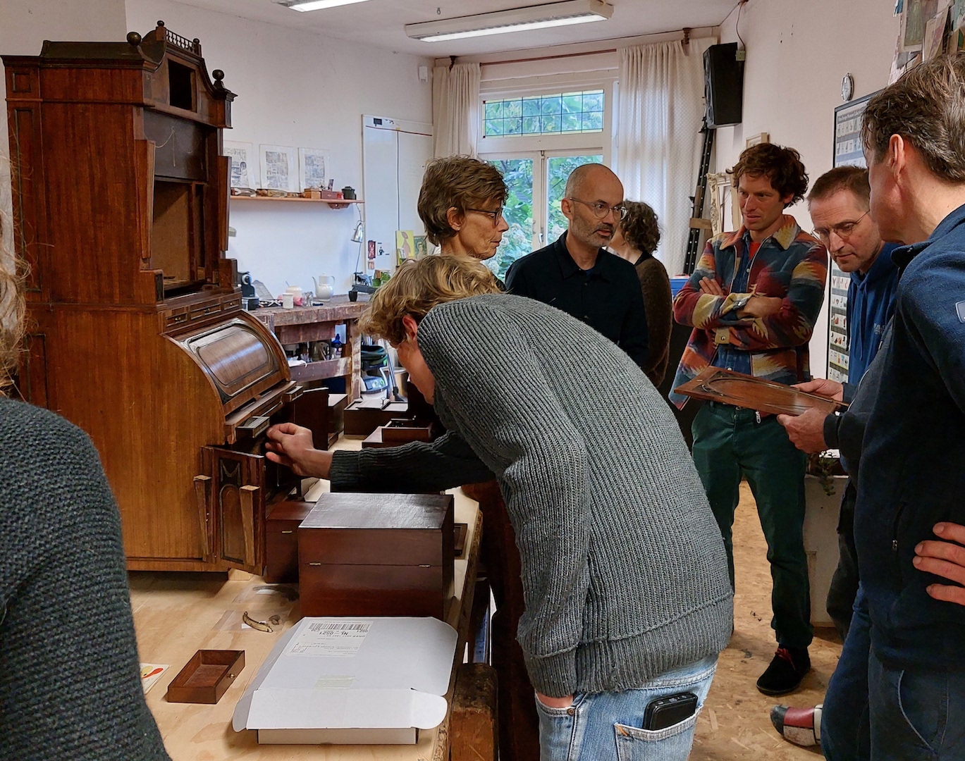 Diverse collega’s (o.a. de meubelrestauratoren van het Rijksmuseum) hebben zich verdiept in het meubel op schaal, maar tot dusver heeft nog niemand de historie van het meubel of het gebruik ervan volledig in kaart kunnen brengen. Wat is de functie van dit meubel? Voor wie en door wie is het gemaakt? Hoe pak je de restauratie van een dergelijk meubel aan? Wat ga je conserveren, wat ga je restaureren? Belangrijke vragen over het meubel en de restauratiebehandeling, waarover Brigitte graag met collega’s wilde sparren. Daarom werd deze bijeenkomst georganiseerd. De 14 aanwezige restauratoren hebben zich gebogen over dit meubel en hun ideeën en bevindingen over het materiaal, toegepaste technieken en over de inhoud gedeeld.