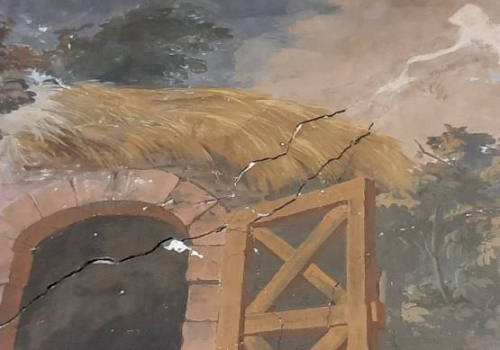 Bij de entreedeur zijn er 3 losse panelen geplaatst. Dit had te maken met de lekkage en brand die in het rookkanaal ontstaan was. De beschilderingen zijn 3 strappo’s en met de originele muurschildering samengevoegd. De vuile vernislaag is met een oplossing van aceton verwijderd.