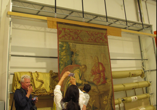 Het net ingepakte tapijt ‘Het leven van Cosimo I de’ Medici’ van 8,5 x 5,5 meter was voor de Senaat in Rome. Het dateert uit de tweede helft van de 16de eeuw. Dit restauratieproject maakt deel uit van een tentoonstelling en van het mooie boek dat eraan gewijd is.