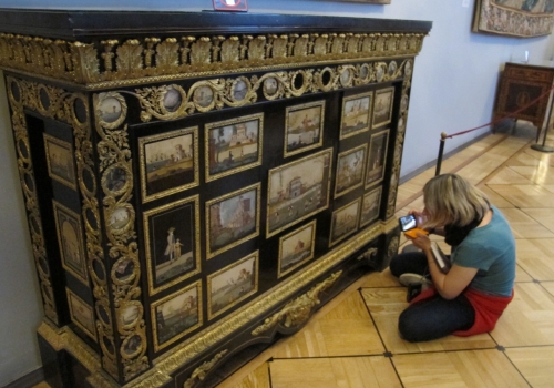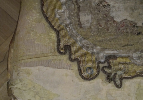 Een rondje van beide textielrestauratoren (waaronder de verslaggever) langs tentoonstellingszalen waar textiel te zien is, riep de vraag op hoe men prioriteiten stelt. Het is wel duidelijk dat er nog enorme hoeveelheden werk liggen te wachten. Er zijn in de opstelling veel wandtapijten, die merendeels op frames gespannen zijn, maar in verschillende stadia van verval dan wel conservering verkeren. Duidelijk werd dat ook aan het textiel gedurende lange tijd bij herhaling aandacht is besteed, te zien aan de verschillende behandeltechnieken in één object, die in een ander tijdperk moeten zijn uitgevoerd. Dat was zichtbaar bij de wandtapijten, maar ook bij enkele stoelen op zaal (foto 10).