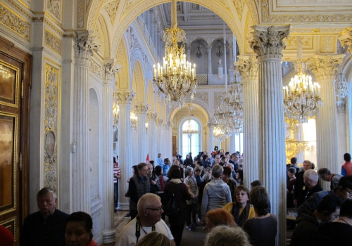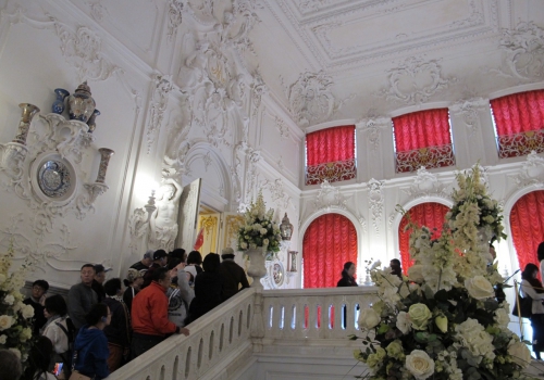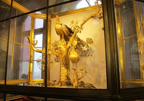Het huidige museumcomplex van de Hermitage is een aaneenschakeling van meerdere paleizen naast elkaar. Het toppunt van decadentie, dat we er bezochten, was toch wel de voormalige eetkamer van Catharina de Grote, waar zij in intieme sfeer met haar vrienden at. Op de plaats waar nu een grote ronde mozaïekvloer ligt, was in Catharina’s tijd een plateau dat in de vloer wegzonk naar een verdieping lager, zodat bedienden daar de eettafel konden voorbereiden en weer naar boven heffen. Zij hadden namelijk geen toegang tot de eetzaal. Maar het hoogtepunt van die zaal is zonder twijfel de ‘Pauwenklok’. Gemaakt als cadeau voor Catharina en toegeschreven aan de Engelse klokkenmaker James Cox, is het het oudste nog werkende voorbeeld van robotica. Het bestaat uit een pauw, een haan en een uil, samen gezeten op een oude eik. Alles in goud, natuurlijk. Eén keer per week is de klok in beweging te zien, maar ook in stilstand trok hij veel bekijks (foto 03, 04). Voor wie hem in beweging wil zien staat er een monitor naast de klok. Ook op internet is hij te bewonderen, bijvoorbeeld op https://www.youtube.com/watch?v=ilPlVRoUl_8 (geopend 9-10-2018)