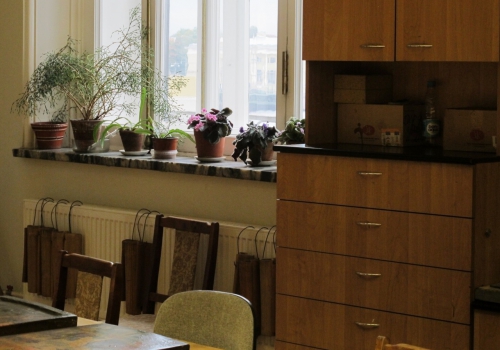 Russen houden van planten. Dat werd wel duidelijk door alle groenvoorzieningen in de werkruimtes. (foto 16) Mogelijk dragen deze positief bij aan het klimaat in de ateliers, maar de Nederlandse collega’s keken er toch van op. Russen zijn ook goed in improviseren en het doen met de spullen die voorhanden zijn. Hoewel niet expliciet besproken zou het kunnen zijn dat het moeilijk is om met de beschikbare financiële middelen uit te komen, zelfs al gaat het hier om een zeer prestigieus museum met enorme bezoekersaantallen. We spraken met de schilderijenrestaurator over licht. In dat atelier is een menging gemaakt van verschillende kleuren TL bakken, in afwachting van een investering in goede atelierverlichting. Maar ook in Rusland is de verkoop van lampen tegenwoordig aan milieuwetgeving gebonden, zodat niet alles wat men zou willen hebben kan worden aangeschaft. Het probleem was nog niet opgelost. Klimaatbeheersing in de ateliers in het oude Hermitage-gebouw bestaat uit aardewerken verdampers, gecombineerd met dubbele ramen. (foto 7) Ter stabilisatie van objecten in behandeling gebruikte men in het keramiekatelier een eenvoudig maar doeltreffend hulpmiddel: een zandbak. (foto 17) Als verpakking van objecten in de ateliers geen luxe op maat gemaakte museumdozen. Hergebruikte schoenendozen werken tenslotte ook, zolang zuurvrij geen vereiste is. Wegwerphandschoen vormen misschien ook een luxe die in Rusland geen common practice is. We hebben ze nergens gezien.