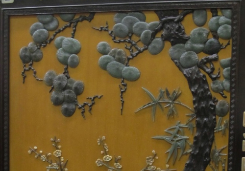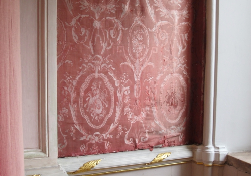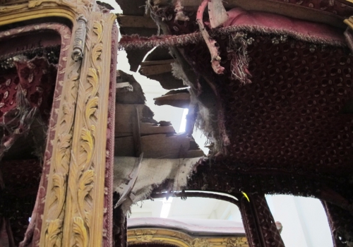 Hoewel op de textielafdeling in de Hermitage werd getoond dat men soms ver gaat met behoud van origineel materiaal, en het uitgangspunt is dat er niets vervangen wordt, lijkt het gebruikelijker dan bij ons om ontbrekend materiaal aan te vullen. Dat gebeurt met grote perfectie, waarbij originele delen en aanvullingen vaak niet van elkaar te onderscheiden zijn. (foto 12, 13) Soms zijn die van soortgelijke materialen (kralen, weefsels), soms synthetische imitaties. Als voorbeeld van dit laatste stond in het grote-objecten-atelier in Old Village een Chinees scherm met een decoratie in reliëf van gekleurde jade, waarvan de motieven deels verloren waren gegaan. De behandeling was nu voltooid en de aanvullingen, die van epoxy waren gemaakt, gingen volledig op in het totaalbeeld van het scherm. (foto 14) Toch waren oude en nieuwe delen voor een expert duidelijk herkenbaar, door de verschillende temperatuur van het oppervlak. Een ander voorbeeld in hetzelfde atelier vormden twee koetsen, die in de jaren ’80 van de 19de eeuw voor Catharina waren gebouwd, waarvan de restauratie nog moet beginnen. Ze zijn ernstig beschadigd geraakt in de Tweede Wereldoorlog en verkeren nog altijd in staat van ruïne, maar nu men over dit grote atelier beschikt kan restauratie eindelijk worden voorbereid. Je zou ervoor kunnen kiezen aan de huidige staat historische waarde toe te kennen, maar herstel krijgt de voorkeur. Er zit dan niets anders op dan grotendeels reconstrueren. Tijdens ons bezoek was het besluit al genomen om de bekledingsstof, die in één van de koetsen nog gedeeltelijk aanwezig is maar zwaar beschadigd, opnieuw te laten weven in Lyon, waar hij zeer waarschijnlijk oorspronkelijk ook gemaakt was. (foto 15)