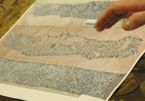 Textielrestaurator Maria vertelt ons dat het atelier waar we zijn oorspronkelijk werd opgezet voor de conservering van vlaggen, die vroeger doorgaans met zetmeellijm op tule werden gezet. Een behandeling die nu niet meer voldoet, we zagen dit ook bij enkele stoelen in de opstelling. (foto 10) In principe moeten al deze objecten opnieuw geconserveerd worden. Lijmtechnieken vormen altijd een interessant discussiepunt onder textielrestauratoren. In veel landen schrikt men ervoor terug om thermoplastische technieken te gebruiken. Ook in dit atelier kiest men daar niet voor, en worden objecten opnieuw gedoubleerd met zetmeellijm, waar overigens een bijzonder mooi voorbeeld van werd getoond. Maar ook werden ons met goudborduursel versierde leren holsters getoond, waar het textiel opnieuw werd vastgezet met behulp van Lascaux acryllijm.