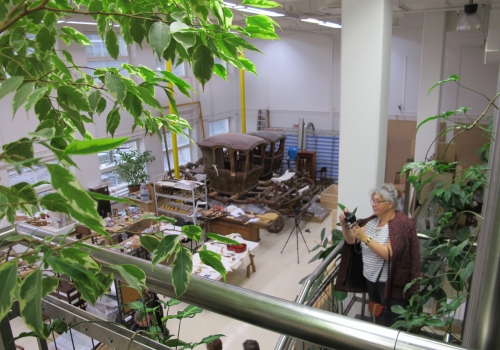 Kijken we naar de Hermitage, dan mogen de vraagstukken waarmee onze collega’s te maken hebben een uitdaging genoemd worden. Niet alleen door de hoge kwaliteit en zeldzaamheid van veel werken in de collectie, maar vooral ook door omvang en omstandigheden. De Hermitage is één van de grootste musea ter wereld, met 70.000 m2 vloeroppervlak en een collectie van ruim 3 miljoen objecten. Deze omvang wordt gecombineerd met een ‘lastig’ klimaat: de extreme Petersburgse weersomstandigheden, de onmogelijkheid het gebouw te klimatiseren, de enorme bezoekersstromen. Al in de 19de eeuw werd een gedeelte van de toen al forse collectie voor het publiek toegankelijk gemaakt door een deel van het paleizencomplex open te stellen als museum. Men had besef van wat we nu ‘collectiemanagement’ noemen, en de noodzaak de objecten te onderhouden. Ze werden daarom keer op keer onder handen genomen en met de tijd zijn ‘typische’ Petersburgse restauratietechnieken ontstaan, waarvan men ons meerdere voorbeelden kon laten zien. Restauratieateliers waren van oudsher in de paleizen gevestigd. Enkele zijn daar nog steeds, maar nu worden die aangeduid als de ‘kleine ateliers’. Wat betreft de faciliteiten bieden deze werkruimtes weinig luxe. Dat geldt in het bijzonder voor het atelier voor schilderkunst, waar de verlichting op vervanging wacht, de stoelen niet de indruk maken aan enige Arbo-wet te zijn getoetst, de klimaatbeheersing is geïmproviseerd (foto 7). En er is echt heel weinig ruimte. In het textielatelier, dat al even weinig ruimte biedt, zijn de voorzieningen al moderner: goede verlichting, betere werkstoelen, computer onder handbereik. Maar sinds 2 decennia beschikt de Hermitage ook over een modern complex, genaamd Old Village, dat in vele opzichten state of the art genoemd kan worden (foto 8). Daar bevinden zich depots en restauratieateliers. In totaal werken er bij de Hermitage 150 restauratoren, verdeeld over 14 studio’s. We kregen in Old Village de ateliers van glas & keramiek en van grote 3D objecten te zien. Tevens werden we rondgeleid over de depotverdiepingen, waar meerdere zalen zijn ingericht als zichtdepot: een combinatie van verantwoorde opslag en tonen (foto 9).