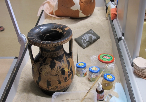 Ten tijde van ons bezoek zijn er op de afdeling keramiek meerdere Griekse vazen in behandeling, in verband met een grote tentoonstelling volgend jaar. De voornaamste vraagstukken gaan over het omgaan met oude restauraties: lijm en overschilderingen. Lijmen met teer en hars werd veelvuldig toegepast, maar dat is nu bikkelhard en kan slechts met zagen verwijderd worden. Tegenwoordig wordt mastiek gebruikt.