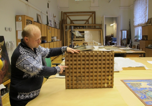 Schilderijenrestaurator Andrej toonde ons wat in de 19de eeuw een typische restauratietechniek voor de Hermitage is geweest: parquettage. (foto 20) Nu is deze techniek allerminst onbekend in andere regionen, maar ons werd uitgelegd dat het bijzondere in de houtsoort schuilt, die niet alleen optimaal flexibel moet zijn in het Petersburgse klimaat, maar ook ruim in de omgeving wordt gevonden: lariks. Een andere methode die in de Hermitage veelvuldig werd toegepast is het volledig wegschaven van het hout, waarna de verflaag, oorspronkelijk op paneel, werd overgebracht op doek. Dergelijke drastische ingrepen worden tegenwoordig niet meer uitgevoerd. Behandeling is veelal preventief en gericht op consolidatie, waarbij zoveel mogelijk natuurlijke materialen worden gebruikt. Als casus liet Andrej een object van beschilderd ijzer zien, waarvan de verflaag loslaat. De gebruikelijke natuurlijke lijmen zijn geen optie, omdat die verwarmd moeten worden aangebracht. Dat zou immers ook het ijzer verwarmen en doen uitzetten. Er wordt daarom gewerkt met gemodificeerde knoflook, waarvan een lijm kan worden bereid met als kleefstof de suikers die erin zitten. Met datzelfde middel hebben de makers oorspronkelijk het metaal voorbewerkt, om een goede hechting tussen metaal en verf te verkrijgen.
