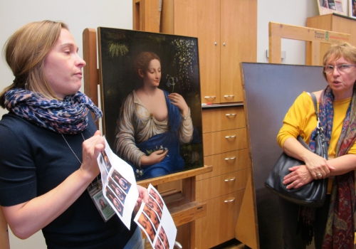 Zijn collega Maria liet enkele werken zien, waarbij technische analyse een belangrijke rol had gespeeld voordat er over de behandeling kon worden besloten. Eén betrof een paneel van een clavecymbel, dat met andere stukken en overschildering was uitgebreid naar een groter formaat, een ander een werk van een leerling van Da Vinci. Een belangrijk deel van dit laatste werk bestaat uit puur ultramarijn, maar de heldere kleur was vrijwel verdwenen onder dikke vernislagen, waar het werk keer op keer mee ‘op orde gebracht’ is in de loop van zijn bestaan (zo’n 600 jaar). De laatste laag is mogelijk van de kunstenaar en is gehandhaafd. (foto 21)