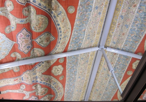 In het zichtdepot is ook een 18de-eeuwse Turkse tent opgebouwd, die in bijzonder goede staat verkeert. Hij vormde ooit een geschenk aan Catharina. Hij is opgezet met behulp van een frame van metalen buizen, de originele palen zijn ernaast te zien. (foto 23, 24) Het was een buitengewoon privilege dat we dit mochten zien. Een bezoek aan de tent is normaal gesproken alleen voorbehouden aan staatsbezoek. Zeer vereerd!