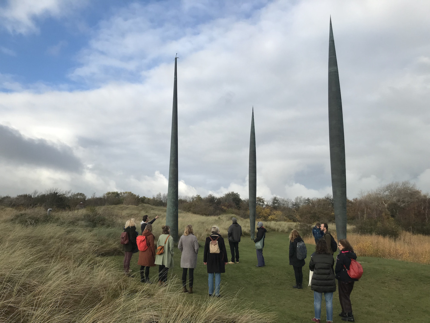 Gijs van de Wint startte de rondleiding met een introductie over De Nollen. Van 1980 tot 2006 werkte kunstenaar R. W. van de Wint op dit braakliggend duingebied in den Helder aan de realisatie van een totaalkunstwerk vol grote beelden en bouwsels. Deze werden verbonden met het duinlandschap dat de kunstenaar ‘boetseerde’ door middel van de beplanting. Na het overleiden van R. W. van de Wint in 2006 namen zijn zoons Gijs en Ruud van de Wint het onderhoud en de realisatie van de nog niet uitgevoerde plannen over. Ze onderhouden de beplanting, beelden en bouwsels en zetten zich in voor de realisatie van een museum naast het duingebied waar de werken op doek van R. W. van de Wint kunnen worden tentoongesteld.