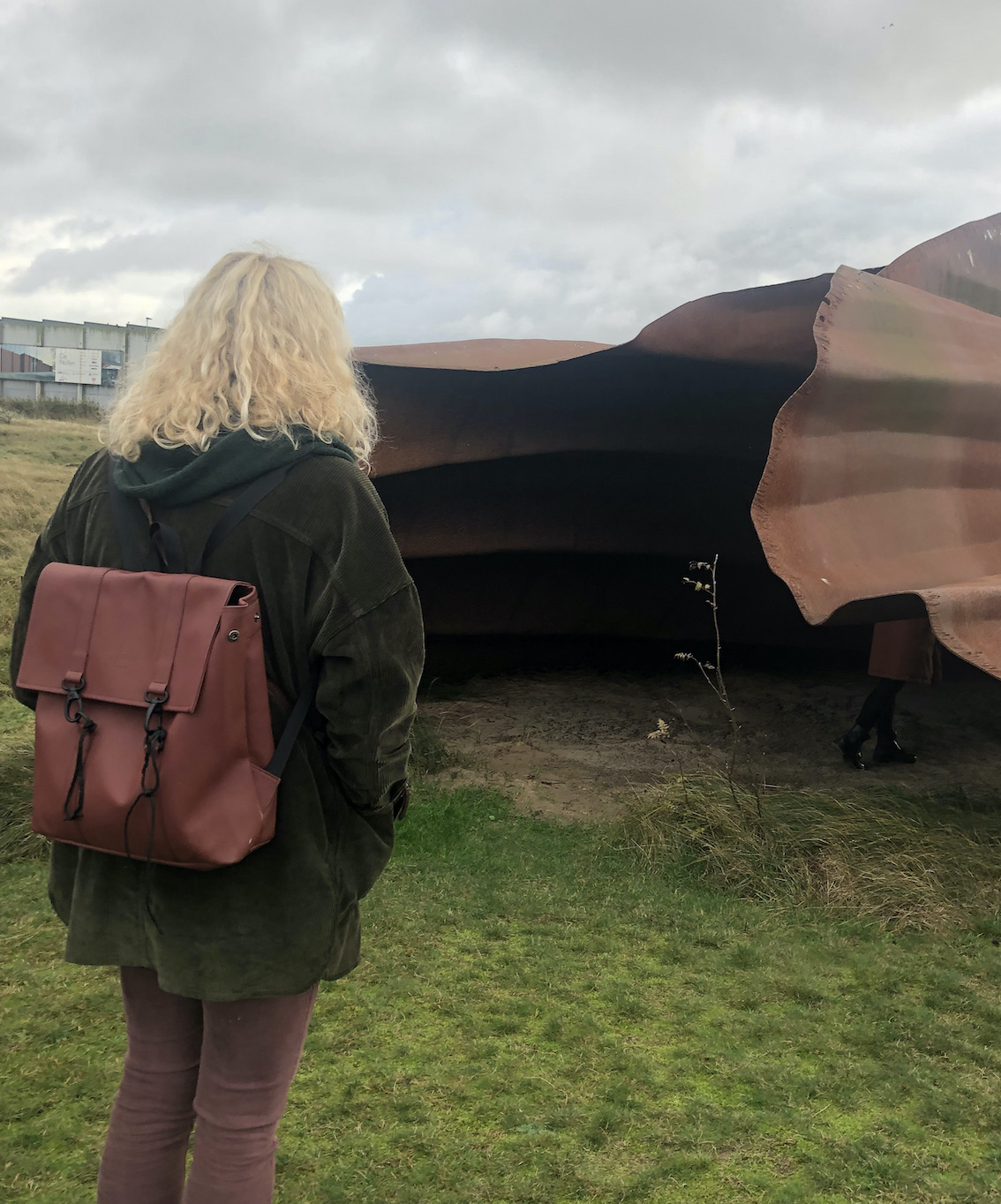 afb. 4 Beeld ‘View’ stond oorspronkelijk in het Kröller Müller Museum en is gemaakt van een grote stalen plaat van 4 mm dik en die is geplooid met een door middel van een grote metaalpers. Deze metaalpers staat in het grote atelier naast het duingebied. Foto: Santje Pander