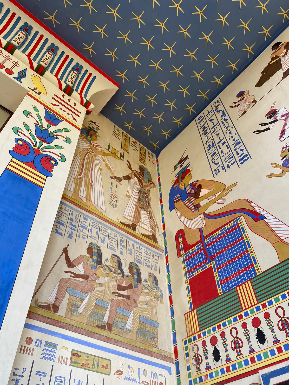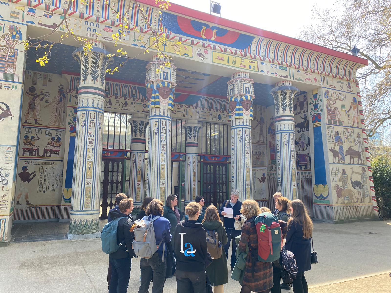 De eerste stop was de rijk gedecoreerde Egyptische Tempel uit 1856. De tempel is een ontwerp van Charles Servais. De decoraties op het stucwerk zijn vijf jaar later aangebracht op door Henri Verbuecken. Bijzonder is dat deze decoraties gebaseerd zijn op echte Egyptische schilderingen. De teksten in de hiërogliefen zijn zelf bedacht en verwijzen naar de dierentuin. De mozaïekvloer binnen is een ontwerp van Architect Emile Thielens uit 1901. Vanaf 2015 zijn Fabian Rasson en Elsbeth Denys betrokken bij de restauratie van het paviljoen. De opdracht die hen was gegeven, een ‘grondige restauratie’, bleek een interessante verwijzing naar het verleden.