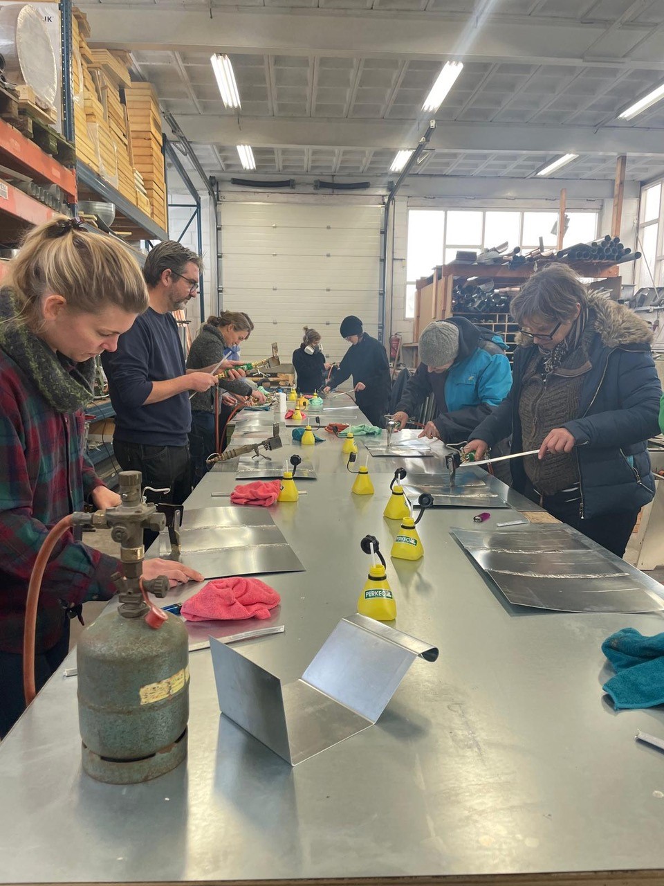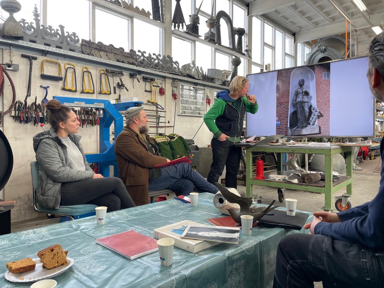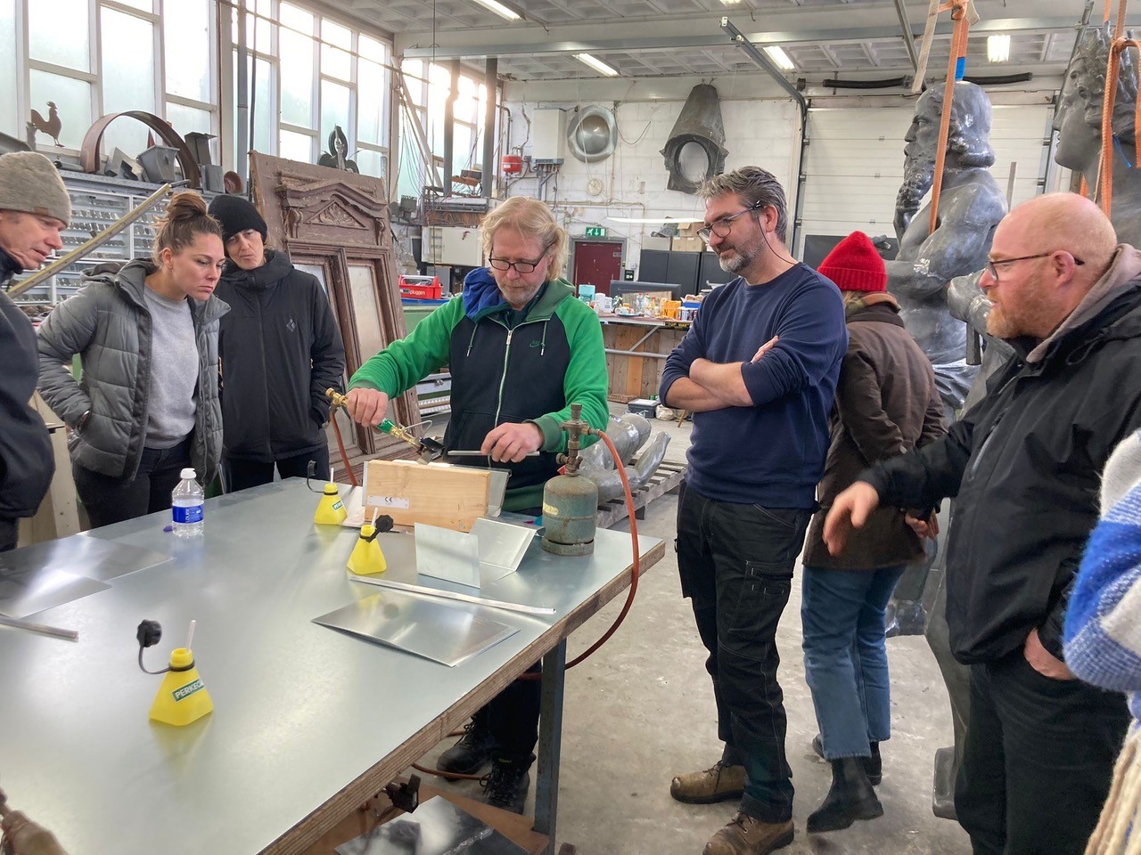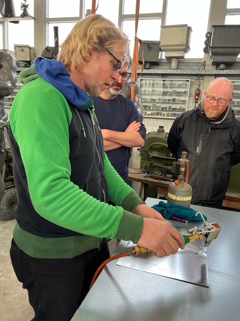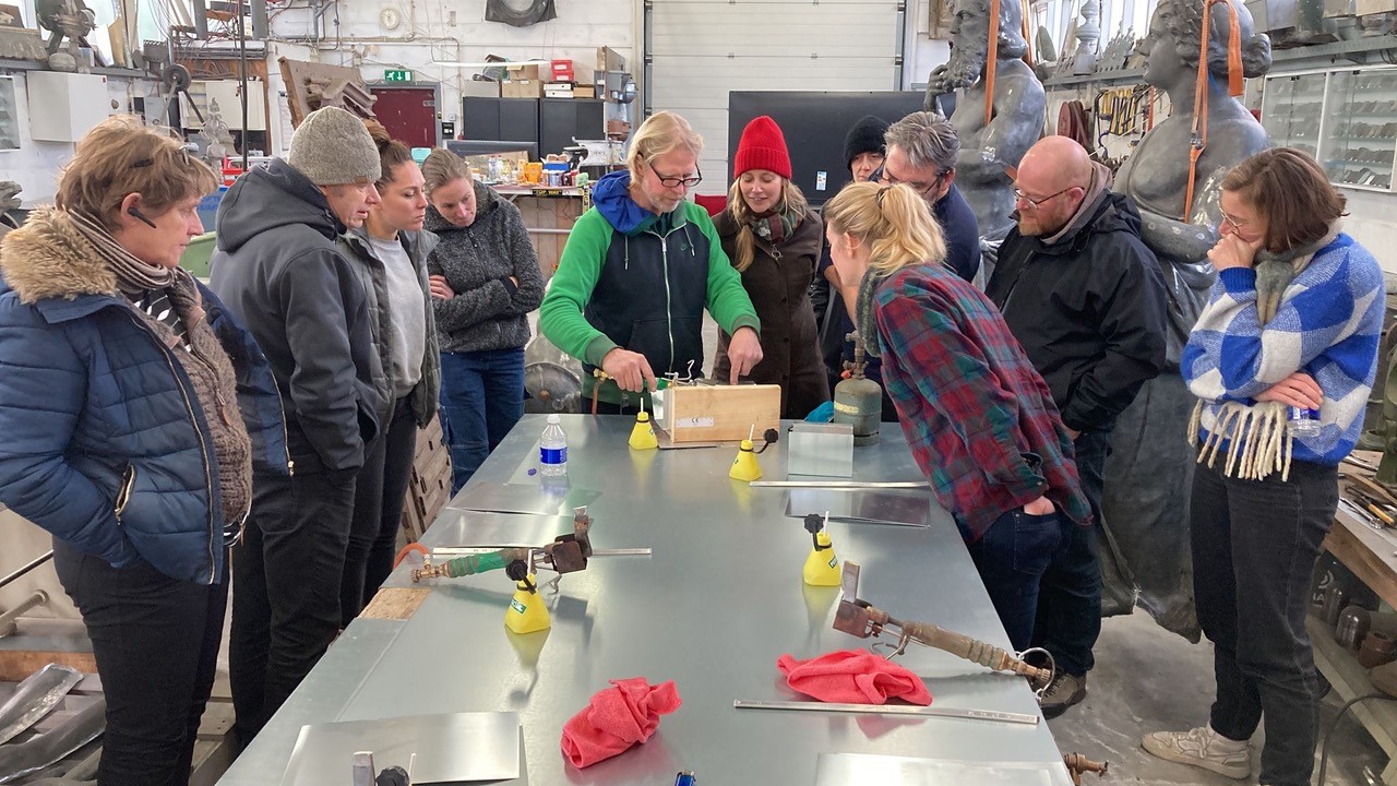 Woensdag 7 december mochten de leden van de Metaal werkgroep langskomen bij het atelier van Jochem Duijts in Groningen, specialist in het bekleden van daken en gevels in zink en koper. Daarnaast restaureert hij dakornamenten van zink, koper en lood. Jochem heeft ons zijn werkplaats laten zien en een presentatie gegeven over de restauratie van de zinken beelden van de Korenbeurs, waar hij op dit moment mee bezig is. Na de presentatie mochten we zelf aan de slag met het solderen van zink! Jochem had voor iedereen een gassoldeerbout, twee zinken plaatjes, soldeervloeistof en soldeer klaar staan. We kregen uiteraard eerst een demonstratie van Jochem voordat we zelf konden oefenen. Het was een erg leuke en leerzame dag in Groningen!